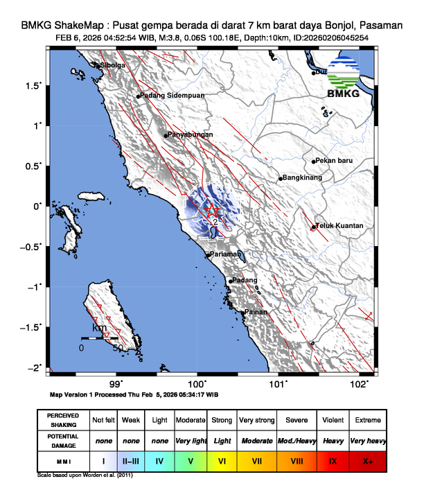 Wilayah Pusat gempa berada di darat 7 km barat daya Bonjol, Pasaman